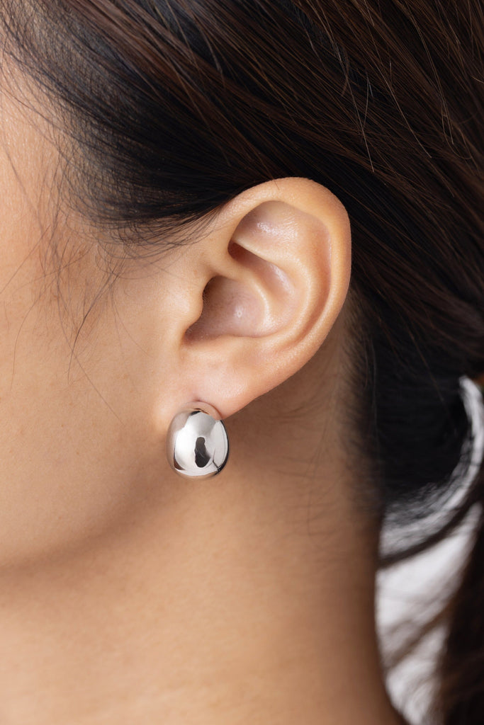 Sleek silver. Crafted with a polished rhodium finish, these minimalist studs offer a lustrous, cool-toned gleam that complements any complexion. The smooth, organic bean shape provides subtle dimension while maintaining a timeless aesthetic. Perfect for layering or wearing solo, these versatile earrings transition seamlessly from office to evening. A sophisticated choice for those who appreciate understated luxury and enduring style.