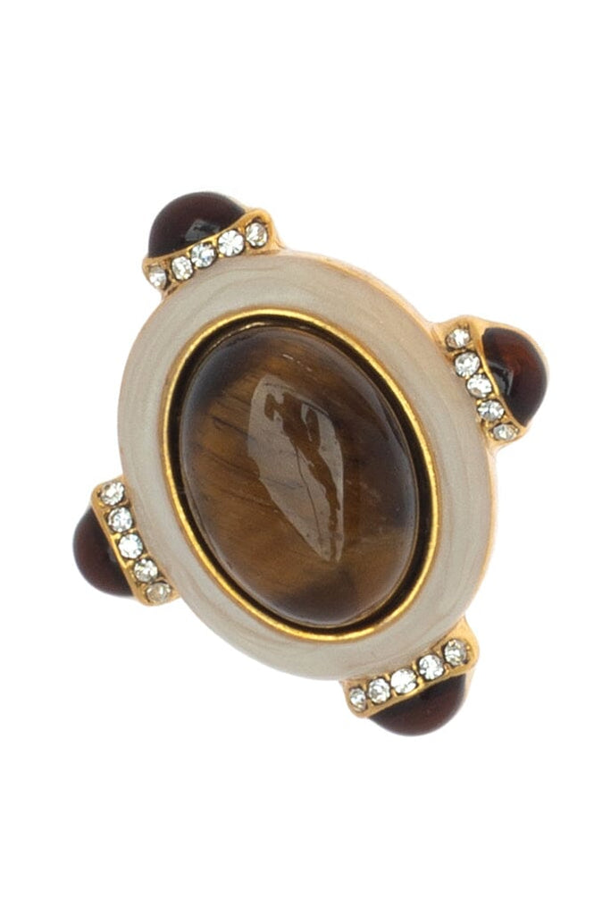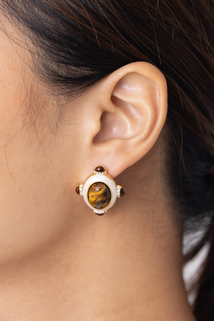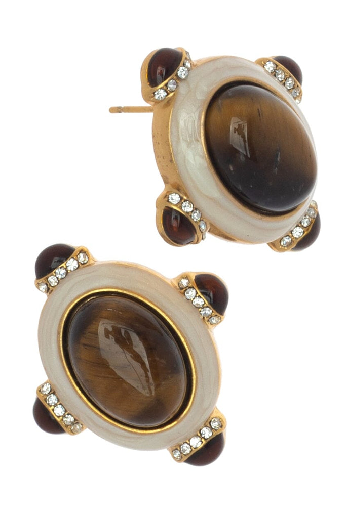 Materials: white natural stone, oval tiger eye stone centerpiece with round accent details on each side, and stud back closure